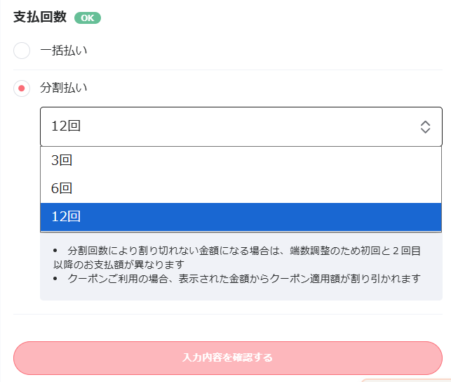 お申込みボタンから、一括・分割支払いを選択し、ご購入者様情報を入力しご購入ください。