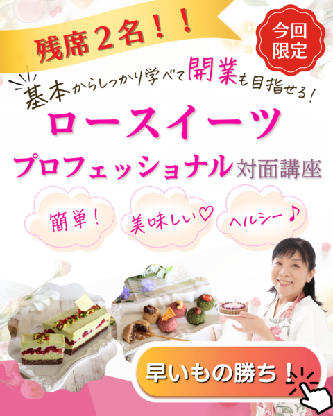 「ロースイーツプロフェッショナル講座」 「ナッツフリーロースイーツ講座」 「ローフードマイスター講座」に興味がある方は、 ぜひお気軽にご相談ください